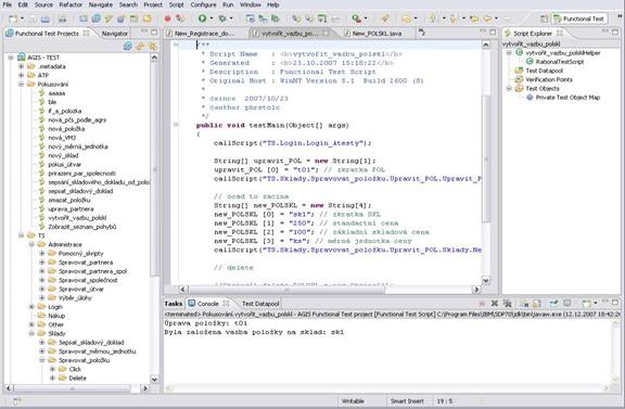 Testové skripty jsou v programu Rational Functional Tester složeny ze zdrojového kódu v jazyce java, který specifikuje akce prováděné nad jednotlivými objekty testované aplikace. Práce s Rational Functional Tester začíná vytvořením tzv. Projektu, pod kterým se bude do námi specifikované stromové struktury ukládat vše, co v nástroji vytvoříme.