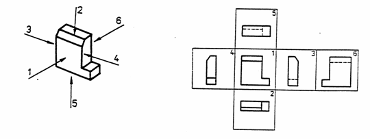 Promítání touto metodou vychází z principu Mongeova promítání. Způsob vytváření jednotlivých průmětů je patrný z obr. 3-1. Ve sdružené průmětně vzniká šest základních průmětů (1 - pohled zepředu neboli hlavní pohled, 2 - pohled shora, 3 - pohled zleva, 4 - pohled zprava, 5 - pohled zdola, 6 - pohled zezadu). Zobrazovaný předmět se v hlavním pohledu umisťuje do průčelné polohy, tj. polohy, kdy rovinné stěny, popřípadě osy předmětu (nebo jejich většina) leží rovnoběžně s průmětnou nebo jsou na ni kolmé. Umístění ostatních pohledů vzhledem k hlavnímu pohledu je závazné. Nelze-li polohu umístění dodržet, lze kterýkoliv pohled vůči hlavnímu pohledu umístit na jiné než určené místo. Přitom je nutné tento pohled i směr pohledu označit určenou symbolikou (šipky, písmeno ze začátku velké abecedy) - obr. 3-2.