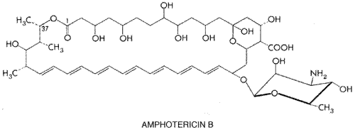 which range in size from 1.6 to 11 DOC has been mixed with a 20% lipid emulsion (INTRALIPID) and infused intravenously. Whether amphotericin B aggregates or is bound to lipid in the infusate is unknown. Nephrotoxicity appears to be less than with DOC at 1 mg/kg, but there is a suggestion that both blood levels and efficacy are also lower (Chavanet et al., 1992). Intravenous infusion of DOC with lipid emulsion is not recommended. Rational use of the lipid formulations has been problematic for hospital pharmacies and physicians. Cost of the formulations is 20 to 50 times that of DOC, raising formidable cost-benefit issues. The person making the choice must weigh the uncertainties about relative efficacy of the lipid formulations against the gravity of potential nephrotoxicity of the formulation in individual patients. In some patients, the additive burden of amphotericin B nephrotoxicity can help precipitate advanced renal failure, with attendant morbidity and financial burden (Wingard et al., 1999). Antifungal Activity Amphotericin B has useful clinical activity against Candida spp., Cryptococcus neoformans, Blastomyces dermatitidis, Histoplasma capsulatum, Sporothrix schenckii, Coccidioides immitis, Paracoccidioides braziliensis, Aspergillus spp., Penicillium marneffei, and the agents of mucormycosis. Some isolates of Candida lusitaniae have appeared to be relatively resistant to amphotericin B. Amphotericin B has limited activity against the protozoa Leishmania braziliensis and Naegleria fowleri. The drug has no antibacterial activity. Mechanism of Action The antifungal activity of amphotericin B depends at least in part on its binding to a sterol moiety, primarily ergosterol, that is present in the membrane of sensitive fungi. By virtue of their interaction with the sterols of cell membranes, polyenes appear to form pores or channels. The result is an increase in the permeability of the membrane, allowing leakage of a variety of small molecules. Additional mechanisms of action may include oxidative damage to fungal cells, at least in vitro. Fungal Resistance Mutants selected in vitro for nystatin or amphotericin B resistance replace ergosterol with certain precursor sterols. The rarity of significant amphotericin B resistance arising during therapy has left it unclear whether or not ergosterol-deficient mutants retain sufficient pathogenicity to survive in deep tissue. Failure of amphotericin B to penetrate the fungal cell wall of some resistant species has been suggested by the greater susceptibility of protoplasts. Absorption, Distribution, and Excretion Absorption of all amphotericin B formulations from the gastrointestinal