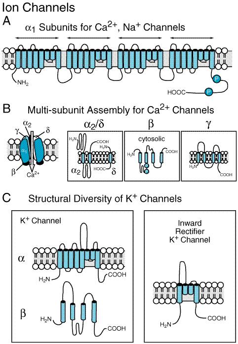 The capacity to integrate information from a variety of external and internal sources epitomizes the cardinal role of the CNS, namely to optimize the needs of the organism within the demands of the individual's environment. These integrative concepts transcend individual transmitter systems and emphasize the means by which neuronal activity is normally coordinated. Only through a detailed understanding of these integrative functions, and their failure in certain pathophysiological conditions, can effective and specific therapeutic approaches be developed for neurological and psychiatric disorders. The identification of molecular and cellular mechanisms of neural integration is productively linked to clinical therapeutics, because untreatable diseases and unexpected nontherapeutic side effects of drugs often reveal ill-defined mechanisms of pathophysiology. Such observations can then drive the search for novel mechanisms of cellular regulation. The capacity to link molecular processes to behavioral operations, both normal and pathological, provides one of the most exciting aspects of modern neuropharmacological research. A central underlying concept of neuropsychopharmacology is that drugs that influence behavior and improve the functional status of patients with neurological or psychiatric diseases act by enhancing or blunting the effectiveness of specific combinations of synaptic transmitter actions. Four research strategies provide the neuroscientific substrates of neuropsychological phenomena: molecular, cellular, multicellular (or systems), and behavioral. The intensively exploited molecular level has been the traditional focus for characterizing drugs that alter behavior. Molecular discoveries provide biochemical probes for identifying the appropriate neuronal sites and their mediative mechanisms. Such mechanisms include: (1) the ion channels, which provide for changes in excitability induced by neurotransmitters; (2) the neurotransmitter receptors (see below); (3) the auxiliary intramembranous and cytoplasmic transductive molecules that couple these receptors to intracellular effectors for short-term changes in excitability and for longer-term regulation e.g., through alterations in gene expression (seeNeyroz et al., 1993; Gudermann et al., 1997); (4) transporters for the conservation of released transmitter molecules by reaccumulation into nerve terminals, and then into synaptic vesicles (Blakely et al., 1994; Amara and Sonders, 1998; Fairman and Amara, 1999). Transport across vesicle membranes utilizes a transport protein distinct from that involved in reuptake into nerve terminals (Liu and Edwards, 1997). Research at the molecular level also provides the pharmacological tools to verify the working hypotheses of other molecular, cellular, and behavioral strategies and allows for a means to pursue their genetic basis. Thus, the most basic cellular phenomena of neurons now can be understood in terms of such discrete molecular entities. It has been known for some time that the basic excitability of neurons is achieved through modifications of the ion channels that all neurons express in abundance in their plasma membranes. However, it is now possible to understand precisely how the three major cations, Na+, K+, and Ca2+, as well as the Clanion are regulated in their flow through highly discriminative ion channels (seeFigures 122 and 123). The voltage-dependent ion channels (Figure 122), which are contrasted with the 'ligand-gated ion channels' (Figure 123), provide for rapid changes in ion permeability. These rapid changes underlie the rapid propagation of signals along axons and dendrites, and for the excitation-secretion coupling that releases neurotransmitters from presynaptic sites (Catterall, 1988, 1993). Cloning, expression, and functional assessment of constrained molecular modifications have defined conceptual chemical similarities among the major cation channels (seeFigure 122A). The intrinsic membrane-embedded domains of the Na+and Ca2+ channels are envisioned as four tandem repeats of a putative six-transmembrane domain, while the K+ channel family contains greater molecular diversity. X-ray crystallography has now confirmed these configurations for the K+ channel (Doyle et al., 1998). One structural form of voltage-regulated K+ channels, shown in Figure 122C, consists of subunits composed of a single putative six-transmembrane domain. The inward rectifier K+ channel structure, in contrast, retains the general configuration corresponding to transmembrane spans 5 and 6 with the interposed 'pore region' that penetrates only the exofacial surface membrane. These two structural categories of K+ channels can form heteroligomers, giving rise to multiple possibilities for regulation by voltage, neurotransmitters, assembly with intracellular auxiliary proteins, or posttranslational modifications (Krapivinsky et al., 1995). The structurally defined channel molecules (see Jan et al., 1997; Doyle et al., 1998) now can be examined to determine how drugs, toxins, and imposed voltages alter the excitability of a neuron, permitting a cell either to become spontaneously active or to die through prolonged opening of such channels (seeAdams and Swanson, 1994). Within the CNS, variants of the K+ channels (the delayed rectifier, the Ca2+-activated K+ channel, and the afterhyperpolarizing K+ channel) regulated by intracellular second messengers repeatedly have been shown to underlie complex forms of synaptic modulation (seeNicoll, et al., 1990; Malenka and Nicoll, 1999).