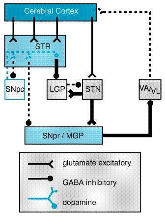 The key feature of this model of basal ganglia function, which accounts for the symptoms observed in PD as a result of loss of dopaminergic neurons, is the differential effect of dopamine on the direct and indirect pathways (Figure 227). The dopaminergic neurons of the substantia nigra pars compacta (SNpc) innervate all parts of the striatum; however, the target striatal neurons express distinct types of dopamine receptors. The striatal neurons giving rise to the direct pathway express primarily the excitatory D1 dopamine receptor protein, while the striatal neurons forming the indirect pathway express primarily the inhibitory D2 type. Thus, dopamine released in the striatum tends to increase the activity of the direct pathway and reduce the activity of the indirect pathway, whereas the depletion that occurs in PD has the opposite effect. The net effect of the reduced dopaminergic input in PD is to increase markedly the inhibitory outflow from the SNpr and MGP to the thalamus and reduce excitation of the motor cortex.