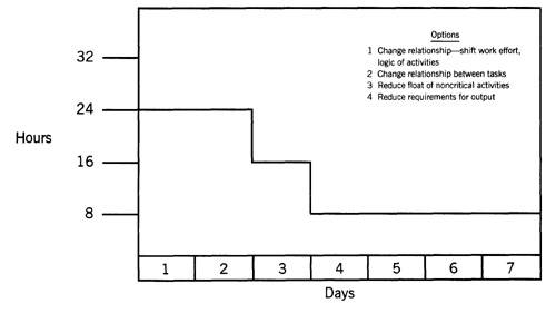 Perry can level his histogram in several ways. He can change the logic of the schedule so that the number of concurrent activities someone is as. signed is less. He can change the relationship between two activities (e.g., change a start-to-start relationship to a finish-to-start one) or add lag between the two activities to reduce concurrency. He can also reduce the float of noncritical activities by lengthening their duration without changing the total hours of effort. Finally, he can reduce the output from certain tasks, thereby leveling the work.