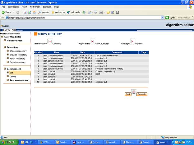 At the current development stage, we distinguish five algorithm states: created, checked out, modified, compiled, stable.
