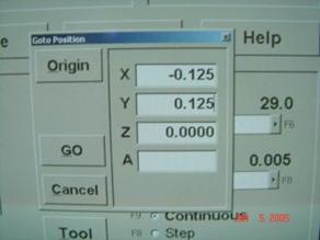 We have now set the X & Y zero values such that the tool is touching the left and front faces of the model. To set the X & Y zero values to be coincident with the South-West corner we will now apply the correction for the tool radius. Move the tool up in Z to make sure it clears the top face of the stock model. Using the Techno-Isel controller software select the GoTo button and specify 0.125 inches in both the X and Y fields as shown and select the Go button. After the machine has stopped moving Zero the machine to this new position. |
