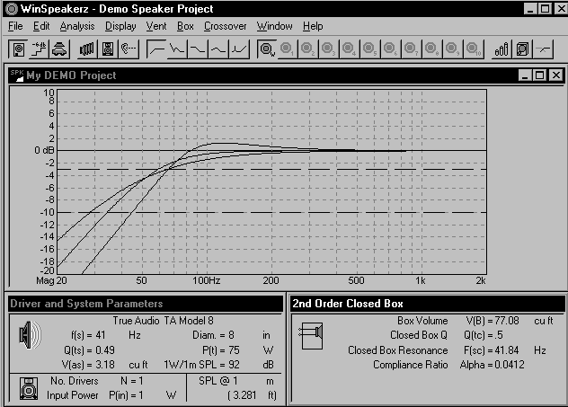 WinSpeakerz predicts the performance of a loudspeaker system before the system is actually constructed. You can perform unlimited 'what if' simulations by varying box sizes and tuning frequencies. The result? Highly optimized speaker enclosures, even on the first try.