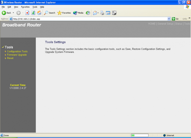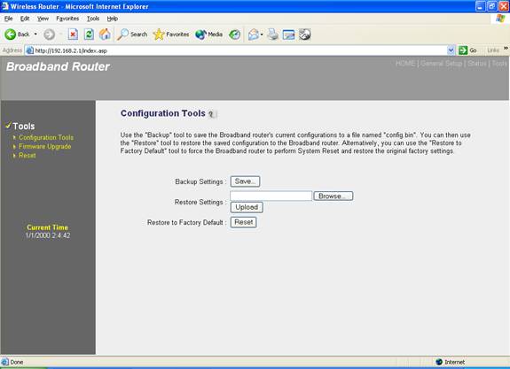 The Configuration Tools screen allows you to save (Backup) the routers current configuration setting. Saving the configuration settings provides an added protection and convenience should problems occur with the router and you have to reset to factory default. When you save the configuration setting (Backup) you can re-load the saved configuration into the router through the Restore selection. If extreme problems occur you can use the Restore to Factory Defaults selection, this will set all configurations to its original default settings (e.g. when you first purchased the router).