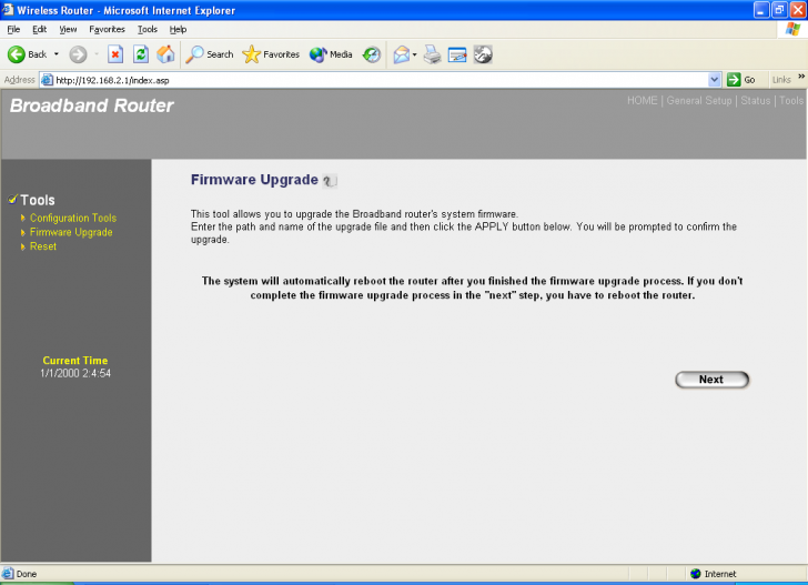 Firmware Upgrade This tool allows you to upgrade the Broadband routers system firmware. To upgrade the firmware of your Broadband router, you need to download the firmware file to your local hard disk, and enter that file name and path in the appropriate field on this page. You can also use the Browse button to find the firmware file on your PC.