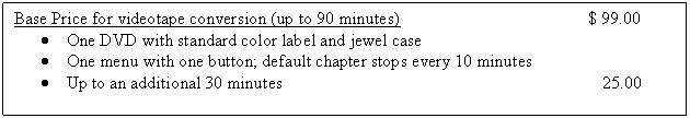 This is the basic video package. There will be one menu with one button as well as default chapter stops every 10 minutes. This means that the customer can use his remote control to skip ahead at 10 minute intervals. This is a no-frills package useful for insuring that the quality of the customers existing videotape is preserved.