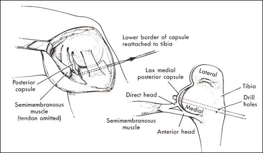 Fig. 13 a.suture through direct arm semimembranosus b.transosseous drillholes c.posterior capsule tensioned over posteromedial capsule (from Miller 98)
