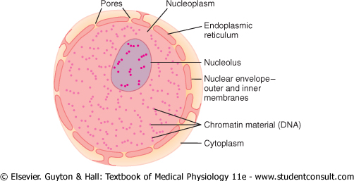 A typical cell, as seen by the light microscope, is shown in Figure 2-1. Its two major parts are the nucleus and the cytoplasm. The nucleus is separated from the cytoplasm by a nuclear membrane, and the cytoplasm is separated from the surrounding fluids by a cell membrane, also called the plasma membrane. |