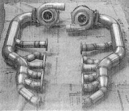 Fig. 10-7. V-12 custom header. The sharp intersections are not ideal for power. Long collector tubes are going to experience large thermal expansion, necessitating flexible braces on the turbos.