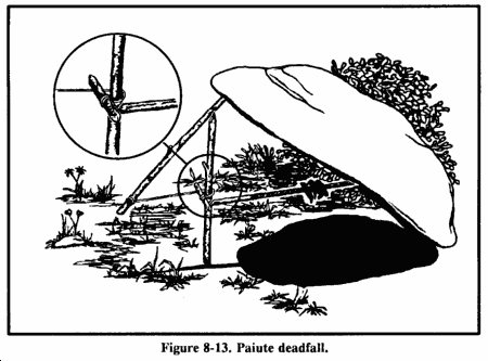 The Paiute deadfall is similar to the figure 4 but uses a piece of cordage and a catch stick (Figure 8-13). It has the advantage of being easier to set than the figure 4. Tie one end of a piece of cordage to the lower end of the diagonal stick. Tie the other end of the cordage to another stick about 5 centimeters long. This 5-centimeter stick is the catch stick. Bring the cord halfway around the vertical stick with the catch stick at a 90-degree angle. Place the bait stick with one end against the drop weight, or a peg driven into the ground, and the other against the catch stick. When a prey disturbs the bait stick, it falls free, releasing the catch stick. As the diagonal stick flies up, the weight falls, crushing the prey.
