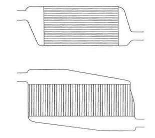 Fig. 5-4. The two moat popular intercooler core styles are plate-and-shell (top) and extruded-tube (bottom}. The plate style generally offers less flow resistance, whereas the extruded-lube style tends to be more efficient. The 'tubes' are typically 1/4' wide by 1 1/2-3' long.