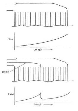 Fig. 5-22. Proper internal baffling can create more uniform airflow distribution through the core and, thus, greater heat rejection. Add the baffle to force half the charge to go through the first half of the core and the remainder through the second half