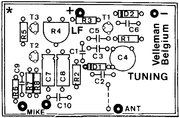 - PCBPLAN.GIF shows the PCB layout from above (components shown). PCBPLAN.GIF is an accurate layout, scanned from the instruction sheet. I have used * to mark one corner for reference.