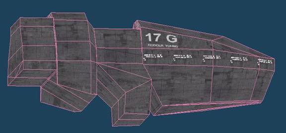 Attach finished Engine Brace Assembly to the rear face of Main Hull Middle as shown below. Note that the bottom face of the Engine Brace Assembly and the Main Hull Middle are flush.