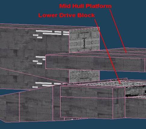 Attach this completed assembly to the front half of the ship. Note that the front face of the Main Hull Middle Lower part is attached to the rear face of the Lower Drive Block. Note that the front face of the Main Hull Middle part is attached to the rear face of the Mid Hull Platform. Align parts carefully as shown below (Ring Top and Ring Bottom omitted for clarity):