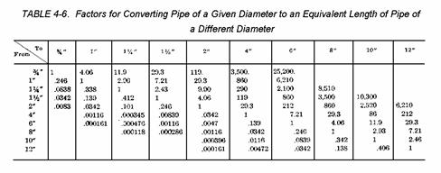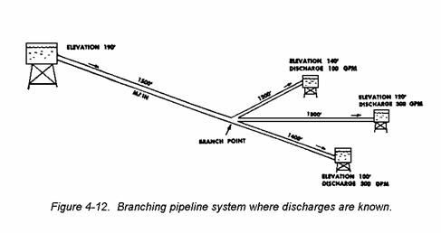 line. In other words, find the pipe of a given diameter which gives the same total head loss as the compound line. Flow problems are then solved as for the simple pipeline. Table 4-6 gives factors for converting a pipe length of a given size to an equivalent length of another size. Figure 4-12 shows a branching pipeline system where discharges are known,