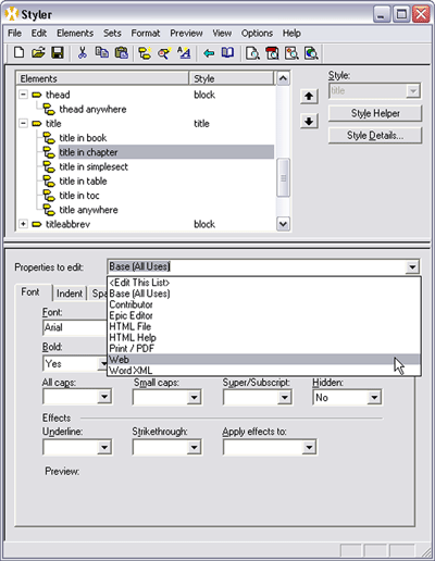 Arbortexts Styler, a new stylesheet development tool available in the Arbortext 5 release, puts stylesheet creation in the hands of designers and reduces or eliminates the need for programming. With its simple user interface, which offers a comfortably familiar set of formatting controls, a designer can define style settings for both electronic and print output without learning any of the stylesheet programming languages.