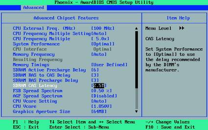 The safest and most correct value for 'SDRAM CAS Latency' is usually printed on a label or etched directly onto the memory module itself. Typical values are 3T or 2.5T for lower-cost memory modules. Change this setting to 2.5T or even 2T, then test your system for stability. Some memory manufacturers claim that 2T-capable memory can also handle higher memory clock rates. If tightening CAS latency succeeds, you may also want to try boosting the memory clock rate by increasing the value for the 'Memory Frequency' option.