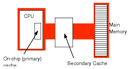 on-chip Level 1 cache. The next level, between the L1 cache and main memory, is