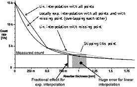 The calibration function hi,j is determined by measurement in a discrete set of points (measured count rates yk at thicknesses xk for k=1..n). Its value has to be computed by interpolation between these points.