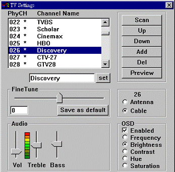 You can fine tune the channel frequency or change the brightness, contrast, saturation and hue by keyboard or optional remote controller. Please refer to Video Display Window for feature description.
