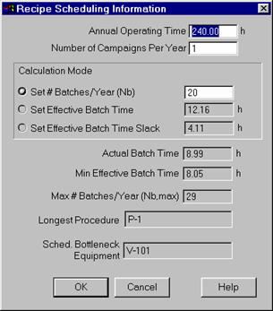 Recipe Scheduling Information - Presents a dialog that allows you to edit the scheduling parameters of the production campaign. This dialog is only active when the plant mode is batch.