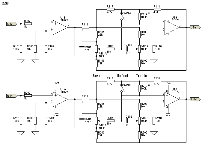 The input stage is configured as shown with a gain of 2 times (6dB), and also acts as a buffer for the tone control circuit. The tone control is a basic Baxandall type, but the addition of R117, 118 and 119 provide flexibility and easy reconfiguration that is not available with the traditional arrangement.