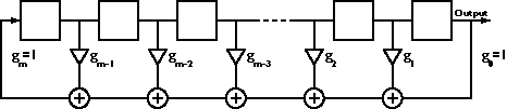 where subscript J is the total number of feedback taps (not including g0), f1 = m is the highest-order feedback tap (and the size of the LFSR), and fj are the remaining feedback taps. The g subscript signifies the Galois LFSR form.