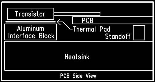 See Figure 2. The printed circuit board will mount on top of the heatsink using 1/4 standoffs minimum to provide ample clearance to avoid the bottom soldered leads from shorting to the heatsink. The transistor leads lay flat and are soldered on top of the printed circuit board pads. Use an aluminum interface block to couple the transistor to the heatsink.