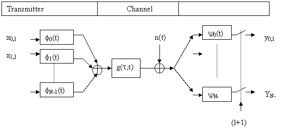 where x0,l, x1,l,xN-1,l are complex numbers obtained from a set of signal constellation points. When an infinite sequence of OFDM symbols is transmitted, the output from the transmitter is a juxtaposition of individual OFDM symbols: