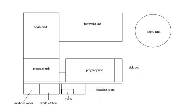 Gestation unit is in loose housing with joint feeding stalls which are only used when the sows are fed or vaccinated and for sorting out sows to be moved. The number of feeding stalls determines the number of there is room for.