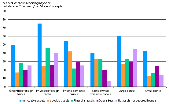 Larger banks are more willing to take both movable and immovable assets as collateral. Type of bank ownership is not particularly important, except that state-owned banks are less willing to accept immovable assets than other banks, which probably reflects the fact that they have not entered the mortgage business. Importantly, objective measures of the quality of the legal environment in the country and the bankers own perceptions of collateral law have statistically significant effects on the probability of accepting collateral. See also Haselmann and Wachtel (2006b).