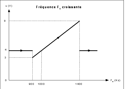 Fe = 1400 Hz et au-delà ; Fs ne peut plus augmenter ; la boucle se déverrouille (Fs ¹ Fe), fs retombe à FS0 = 1000Hz, l’écart de fréquence (Fe – Fs) = 400 Hz puis croit, cet écart est de fréquence supérieure à la bande passante du filtre passe-bas, donc u = 4 V = cte .