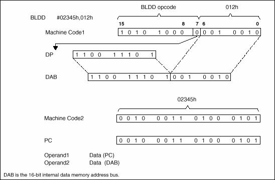 Remarque : il existe des instructions utilisant 2 opérandes, c’est le cas pour les instructions BLDD (BLock move from Data memory to Data memory), BLDP (BLock move from Data memory to Program memory) et BLPD (BLock move from Program memory to Data memory). Ces instructions sont utilisées pour rapatrier des données ou des instructions de la mémoire externe vers la mémoire interne pour accélérer les traitements ultérieurs.