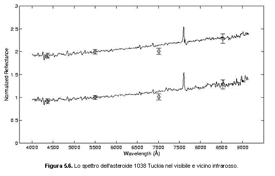 Come si è detto precedentemente, non sappiamo con esattezza di cosa siano composti gli asteroidi. E’ però opinione diffusa che questi oggetti presentino un vasto spettro di composizioni: sarà necessario esaminarne da vicino un buon numero prima di avere un’idea chiara della loro natura. Non è tuttavia impossibile effettuare qualche studio da terra. Una tecnica molto usata è la spettrofotometria. Si tratta in sostanza di esaminare la luce solare riflessa da un asteroide a varie lunghezze d’onda, costruendo una “curva” che è caratteristica dell’asteroide esaminato (vedi figura 5.6). Utilizzando questi dati, è possibile classificare gli asteroidi in base alla loro risposta spettrofotometrica, e tentare così una sorta di tassonomia, un po’ come si fa con le specie viventi in base alle loro caratteristiche fisiche.