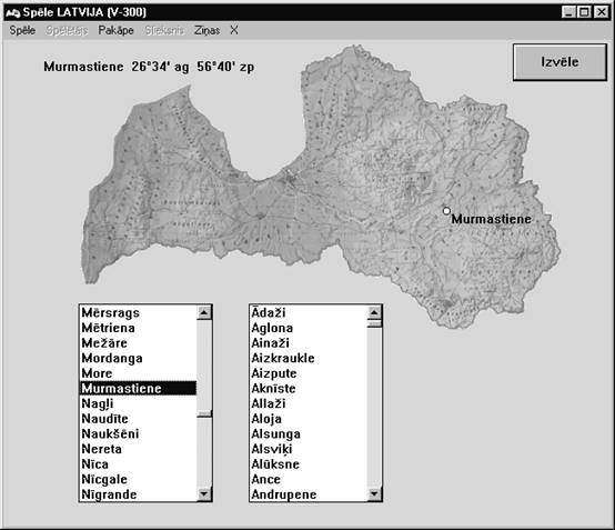 Izvēles stavoklī spēles loga redzama Latvijas karte, četras spiedpogas parejai uz citiem stavokļiem un piekta izejai (1. zīm.). Nospieot spiedpogu, kas atbilst vienai no abam spēlēm, sakas nenosaukta spēle, kura nav uzdots spēlētaja vards (par to liecina uzraksts 'Spēlētajs: ' . Tad var spēlēt vienu spēli vai sēriju no vairakam spēlēm, bet iegūtie rezultati saglabajas tikai spēlēanas laika un pazūd, parejot uz citu stavokli vai citu pakapi.
