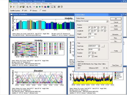 Visi stebėjimai buvo atliekami 2005 balandio 7 dieną. Pirmiausia buvo nustatytas matomų palydovų skaičiaus kitimas paros bėgyje. 2 paveikslėlyje parodytas matomų GPS ir GLONASS palydovų skaičiaus kitimas priklausomai nuo paros laiko.