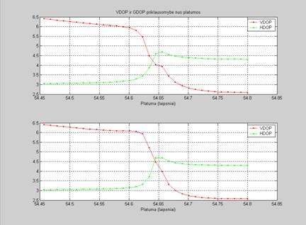 3 paveikslėlyje pateikiamos konkrečių DOP diagramos. Nesunku pastebėti, kad, padidėjus matomų palydovų skaičiui, ymiai sumaėja DOP reikmės. Tokiu būdu gaunami tikslesni matavimų rezultatai.