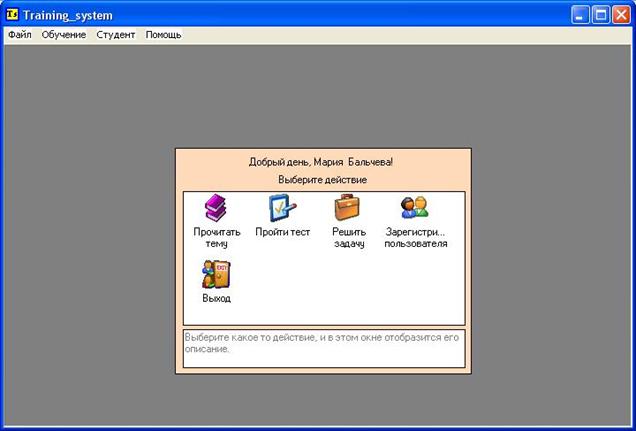 Основні елементи методики проектування навчальних комплексів наведені в даному дипломному проекті реалізовані в инструментально - програмному середовищі системі Training_system. Істотними особливостями инструментально- програмного середовища даної системи є чітка простота й доступність для широкого кола тих, яких навчають,. Розгалужені меню, різні підказки, розвинена система допомоги, швидкий і адекватний відгук на будь-які дії, продумана колірна гама робить навчання й рішення задач за допомогою критеріїв ручним і приємним.