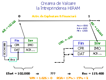 Analiza eficientei tehnologice si manageriale a intreprinderii HIRAM SA, studiate in aceasta lucrare, se face dintr-o perspectiva investitionala, respectiv prin estimarea plusului de valoare obtinut la sfarsitul exercitiului financiar din exploatarea capitalului investit in activele economice de la inceputul anului (AE0 = Imo0 + ACRnete0). Sub ipotezele de mai sus [3], modelul de evaluare a performantei rezulta din respectarea a doua reguli complementare ale eficientei investitiei de capital: