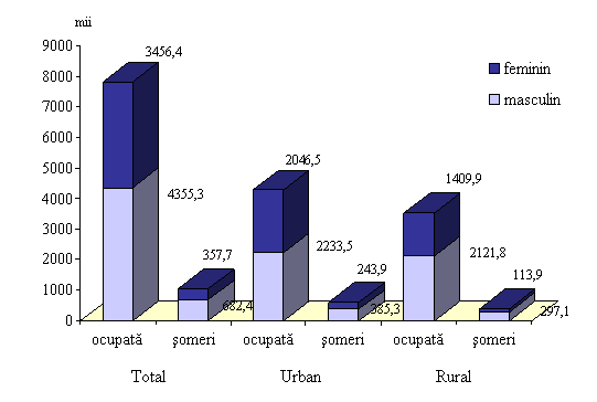 De remarcat faptul cǎ, daca in perioada 1990-2000 procentul populatiei ocupate din mediul urban era in scǎdere in comparatie cu populatia ocupatǎ din rural (de la 55% in 1996, la 49,2% in 2001), dupa 2001 situatia a devenit inversǎ, asa cum reiese si din graficul de mai jos .