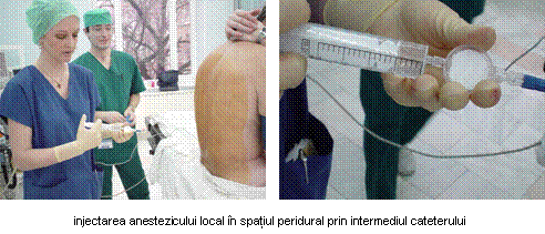* Cateterul este fixat cu benzi adezive, urmand un traiect paravertebral; se injecteaza anestezicul local ales pentru anestezia peridurala (injectarea se face fractionat, urmarind monitoarele si reactiile pacientului); pozitionarea pacientului nu are influenta asupra difuziunii anestezicului.