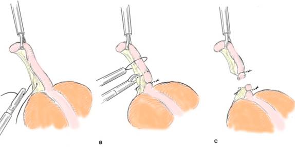 Fig. 19 - Apendicectomia laparoscopica: ligatura arterei apendiculare cu fir (A), ligatura bazei apendicelui cu fir neresorbabil (B), sectiunea apendicelui (C)