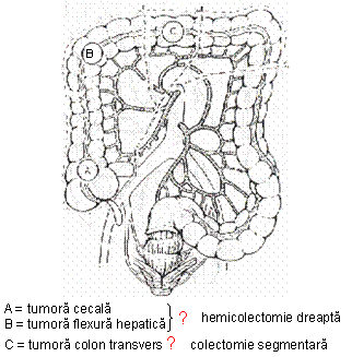 - in cazul tumorilor situate pe colonul transvers si sigmoid, se practica colectomie segmentara (prognostic similar cu cel consecutiv interventiilor mai mutilante), in care se rezeca tumora respectand limita de siguranta oncologica si vascularizatia segmentului, astfel incat sa poata fi posibila restabilirea continuitatii digestive prin colo-colostomie;