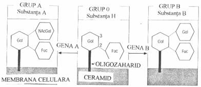 Gruparile glucidice ale glicoproteinelor membranei eritrocitare au rol dominant in determinarea specificitatii de grup sanguin, asa cum au evidentiat studiile de digestie enzimatica controlata. Eritrocitele tuturor grupelor sanguine au un precursor antigenic comun - antigenul H (codificat de gena H), bine exprimat pe suprafata antigenelor de grup 0 si in cantitati progresiv descrescande pe hematiile de grup A, Bsi Ab.
