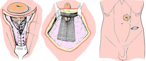 Fig. 11 - Cura chirurgicala a eventratiilor parastomale: reparare clasica (stanga); reparare cu plasa subaponevrotica (mijloc); repozitionarea stomei (dreapta) (1)