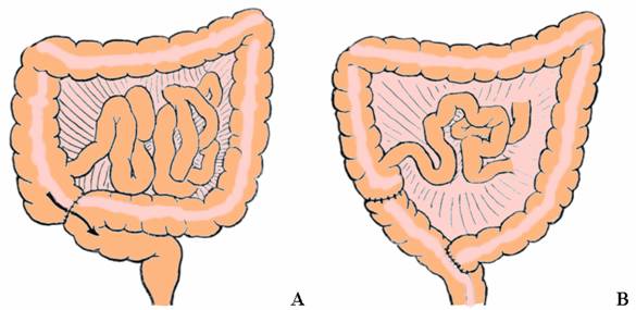Fig.7 - Ceco-sigmoidostomie: A. latero-laterala; B. in Y (5)