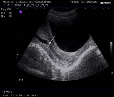 Fig. nr.11. Sac ovular intrauterin la o sarcina de 5 sapt., ecografia abdominla ( zona anecogena rotunda marcata cu sageata )